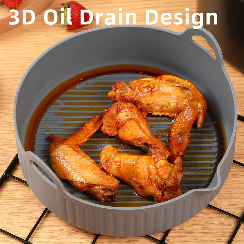 Parrilla redonda de silicona personalizada de fábrica, bandeja para hornear horno, cesta de pollo frito, sartén de aire, olla de silicona con forro