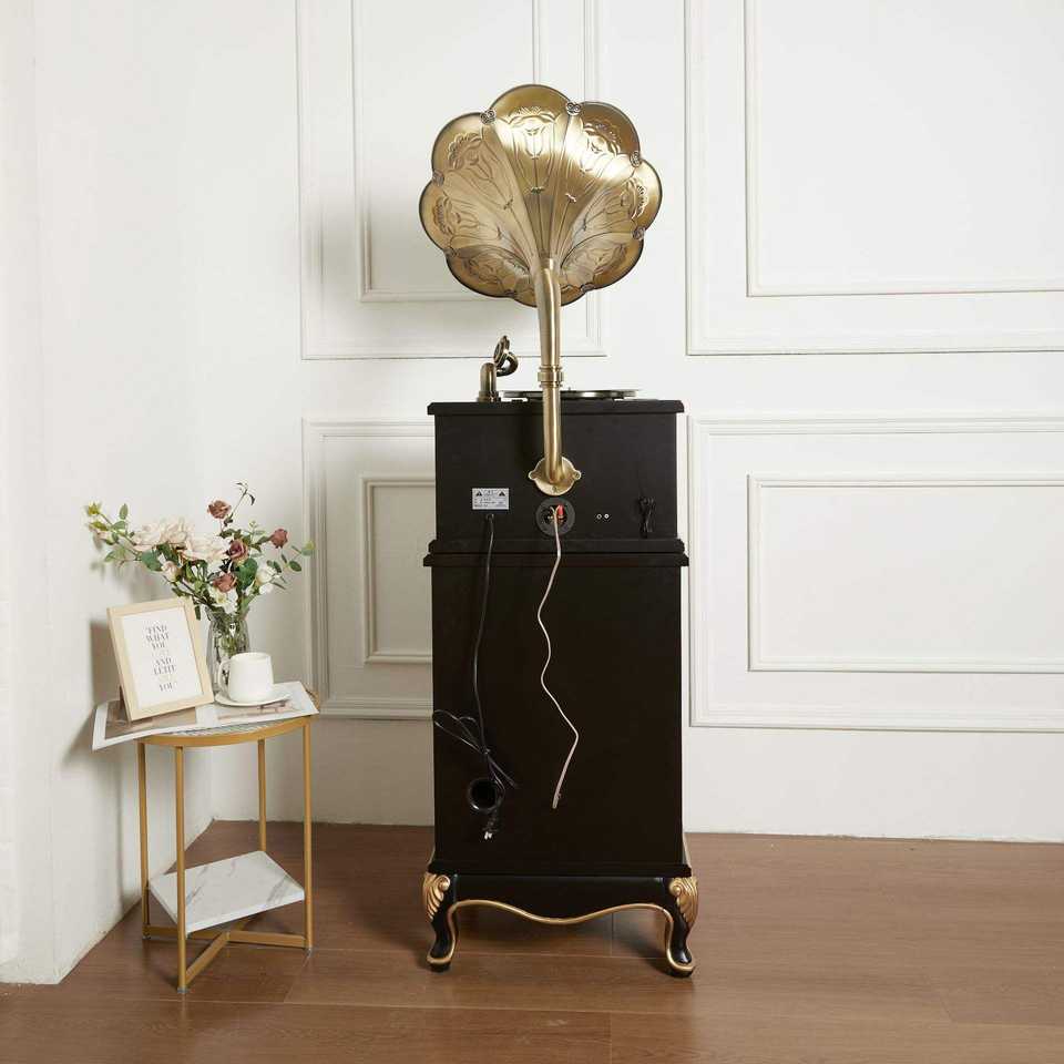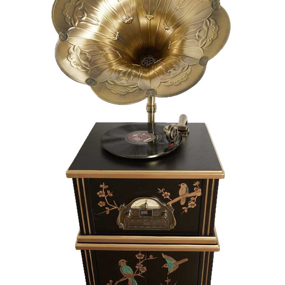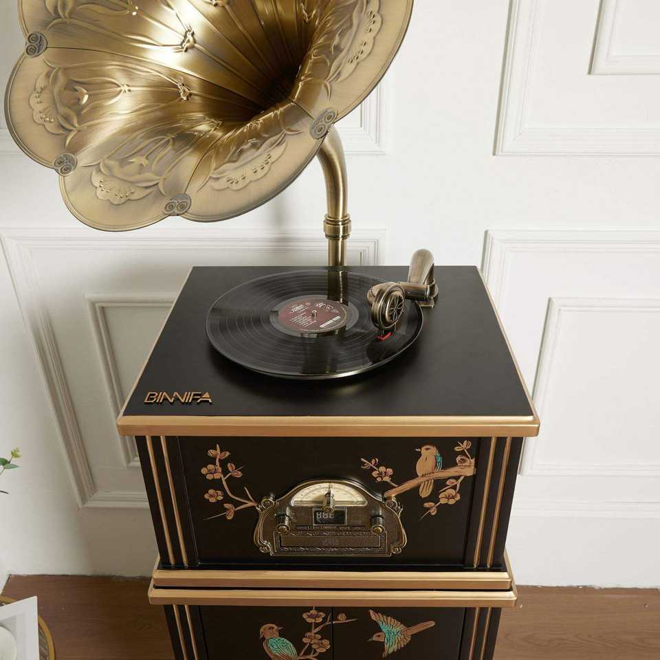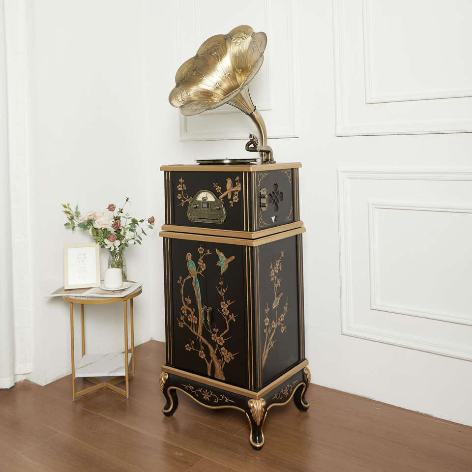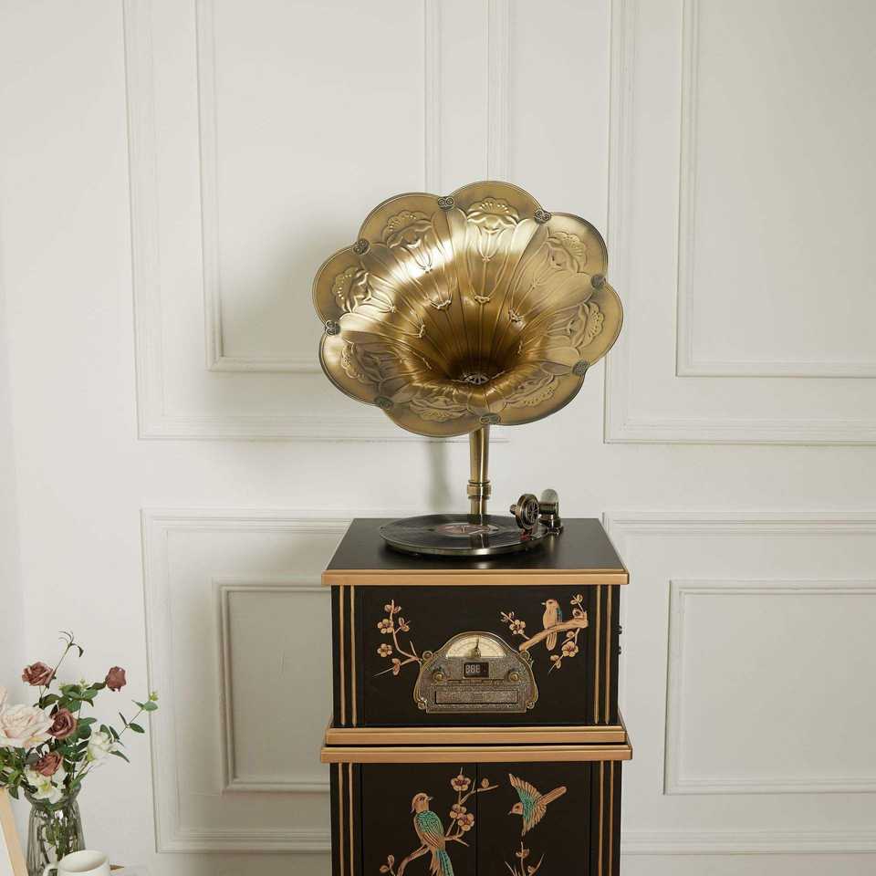 Gramófono de Madera Personalizado de Fábrica, Pintado a Mano con Aves, 3 Velocidades, BT, FM, con Bocina de Cobre Dorado, Reproductor de Discos de Alta Fidelidad