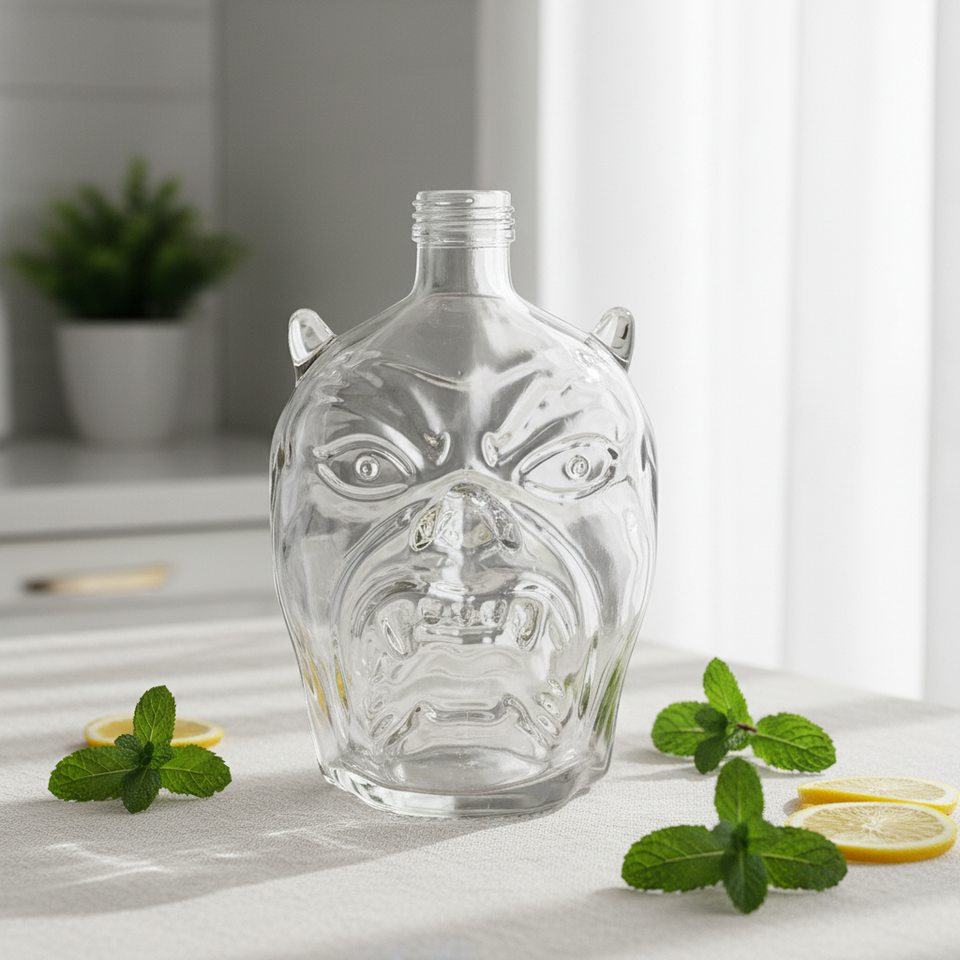 Botella de Vidrio con Diseño de Cabeza de Demonio, Personalizada de Fábrica, Elegante y Transparente, con Tapa de Rosca, para Whisky, Vodka, Brandy y Tequila