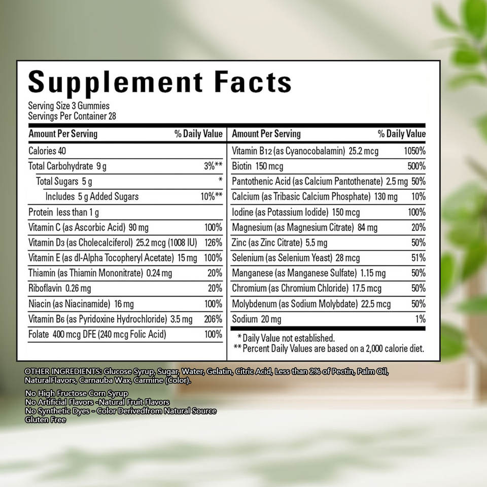 Vitamina C, Vitamina D3, Vitamina E, Vitaminas B, Zinc, Yodo, Calcio, Selenio, Cromo, MagnesioIngrediente principal