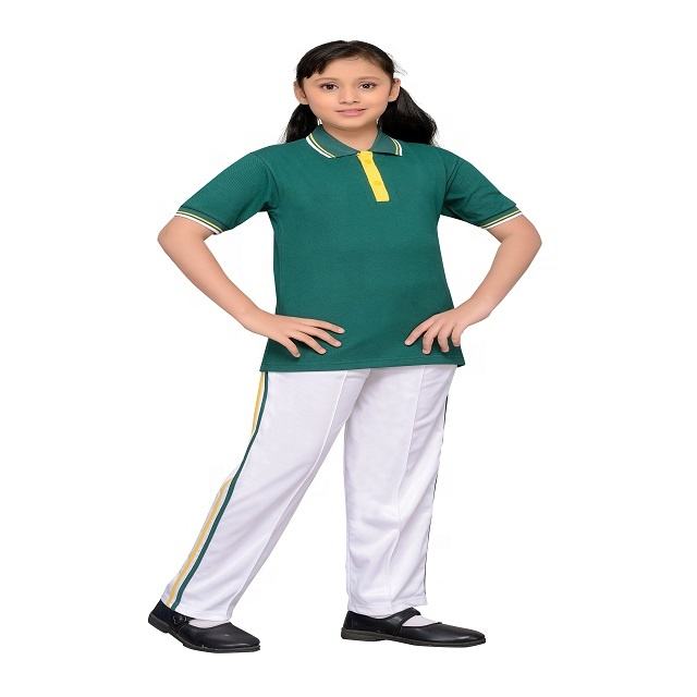 Personalización de fábrica Niñas Escuela Ropa deportiva Uniformes Conjunto Camiseta verde Conjunto de pantalón de chándal gris