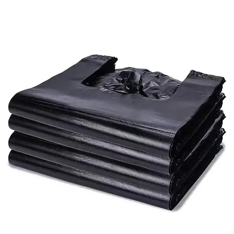 Bolsas de camisetas de plástico PE negro personalizadas directas de fábrica, estiramiento fuerte, reutilizable para embalaje