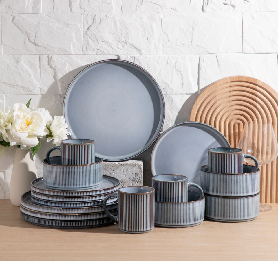 Juego de Vajilla de Gres Acanalado Personalizado Directo de Fábrica, Vajilla de Cerámica Vintage Azul Niebla al por Mayor para Restaurantes y Hoteles