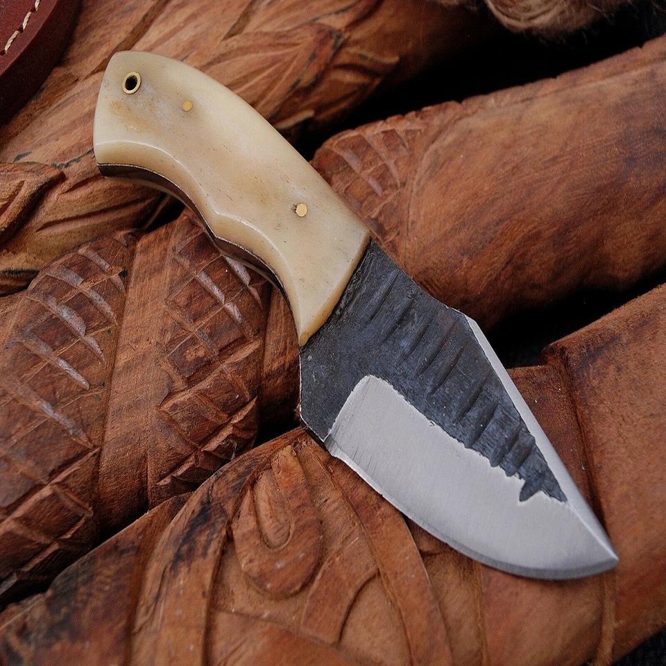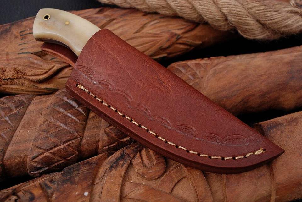 Cuchillo de Caza DIY OEM de Acero de Damasco de Espiga Completa, Directo de Fábrica, para Supervivencia al Aire Libre, con Mango de Hueso y Funda de Cuero, Logotipo Personalizado