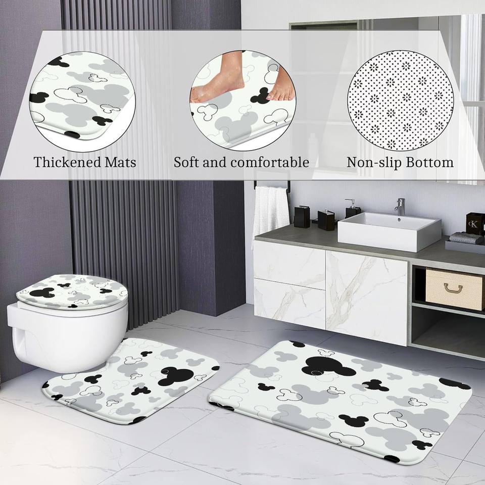 Juego de Cuatro Piezas de Cortina de Baño de Poliéster Impermeable y Resistente al Moho, Diseño de Dibujos Animados de Mickey y Minnie, Venta Directa de Fábrica