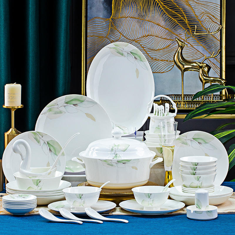 Juego de Vajilla de Porcelana China con Diseño de Hojas Verdes, 60 Piezas, Apto para Microondas y Lavavajillas, Directo de Fábrica, para Hotel o Boda