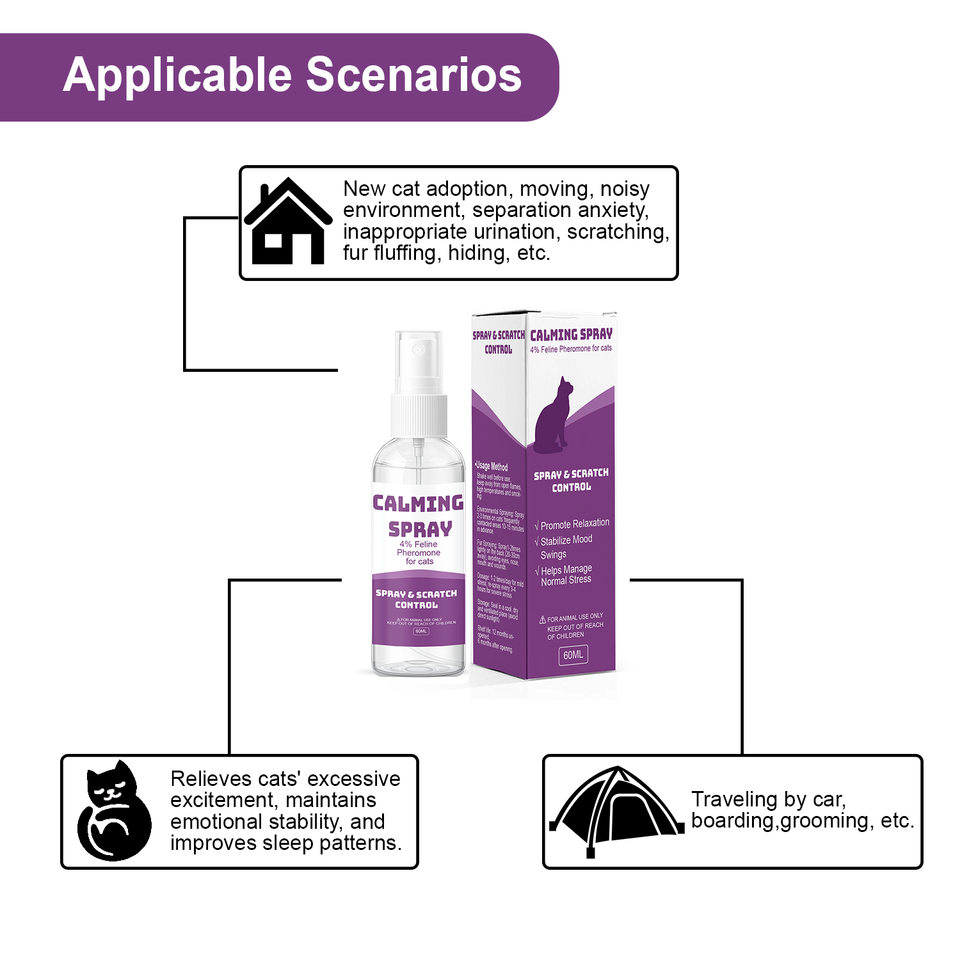 Spray Calmante Natural para Gatos Directo de Fábrica, 4% Feromonas Felinas, Anti-Ansiedad y Control de Arañazos, Spray Relajante para Mascotas 60ML