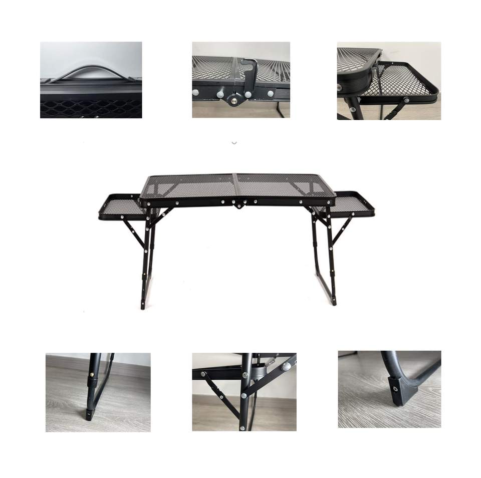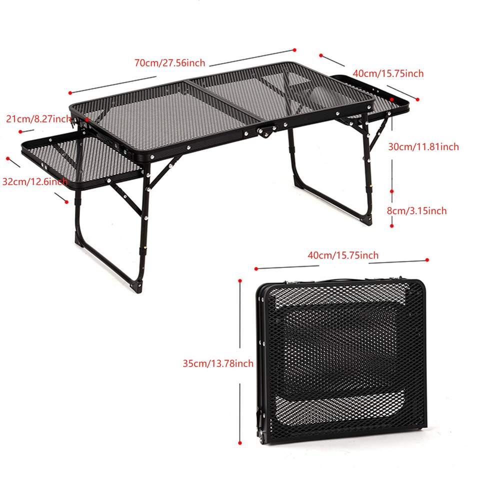 Mesa de camping plegable al aire libre directa de fábrica, mesa de barbacoa de malla de acero pequeña con alas, altura ajustable, transporte portátil
