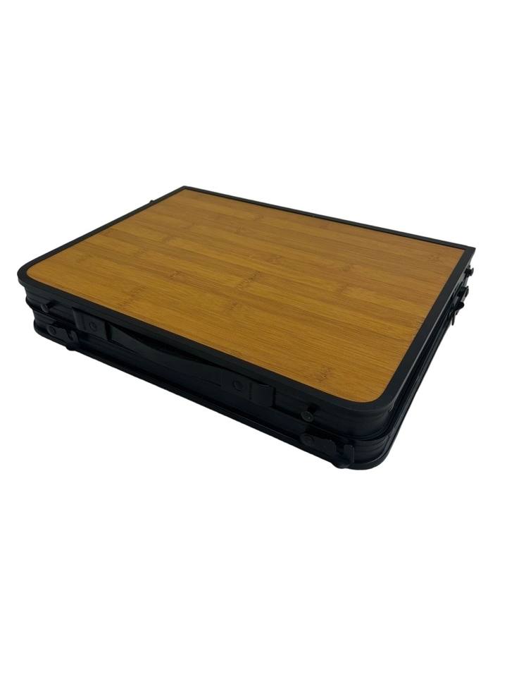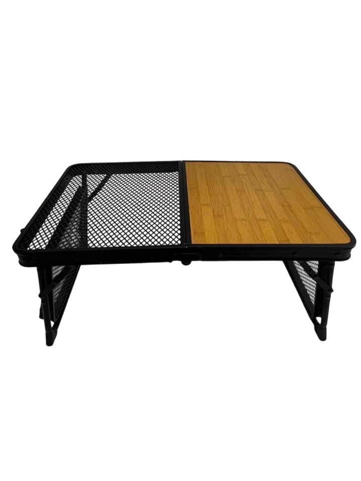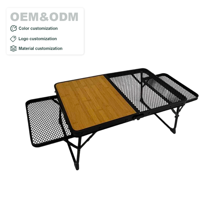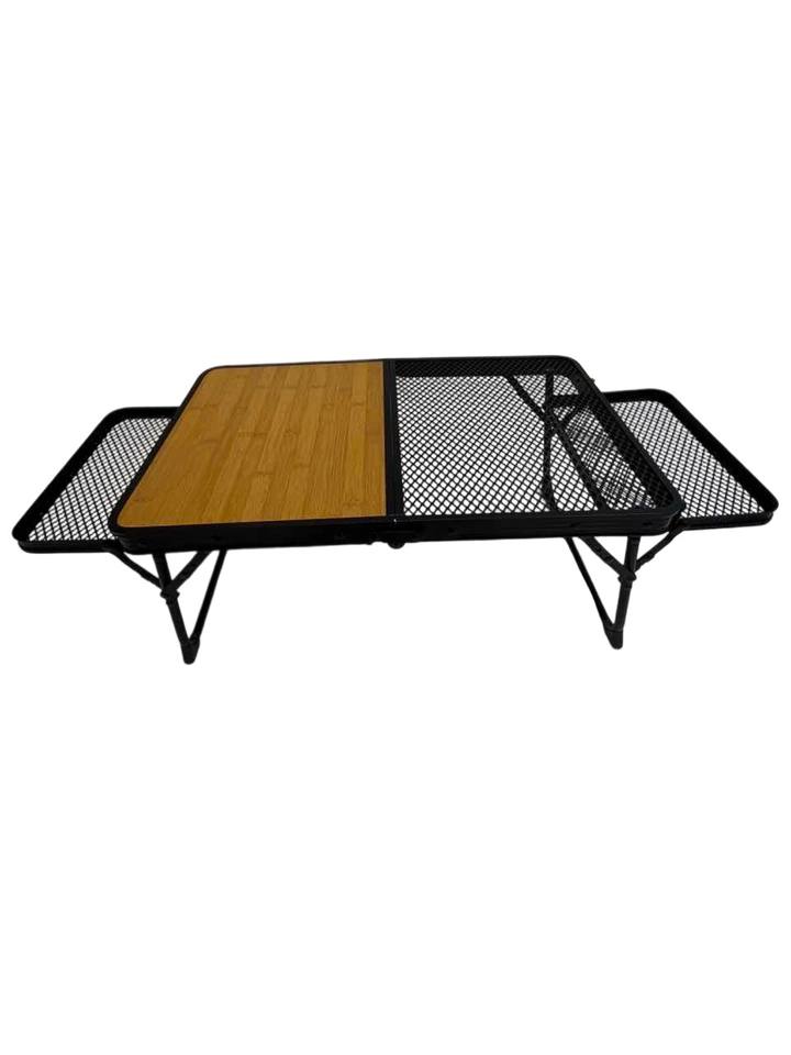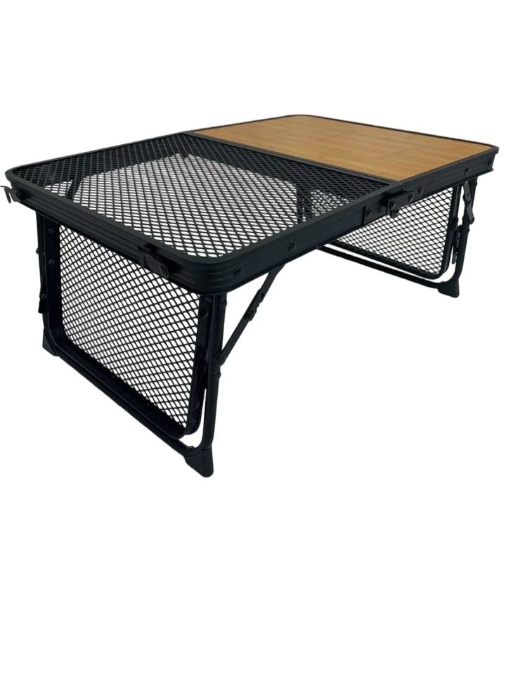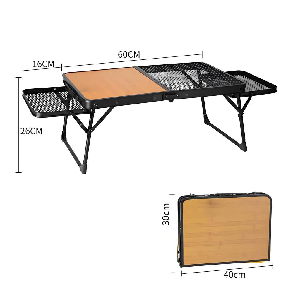 Mesa de comedor plegable portátil moderna para uso en exteriores, madera y metal ligeros con alas de malla de alambre para acampar en la playa