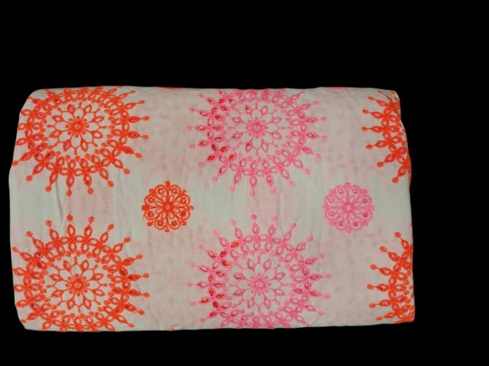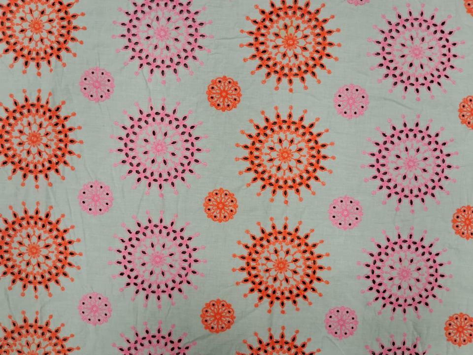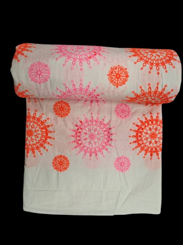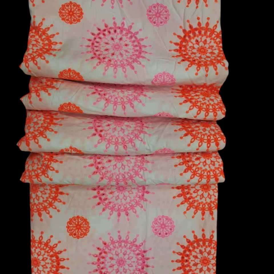 Tela de Algodón Premium con Bordado de Ojales Directo de Fábrica – Diseño Floral Mandala Vibrante en Rosa y Naranja sobre Base Blanca para Vestidos