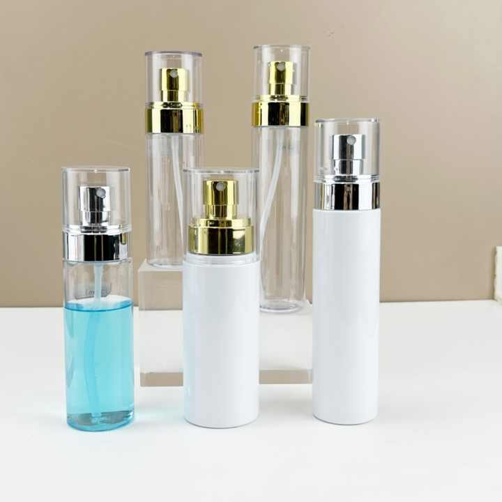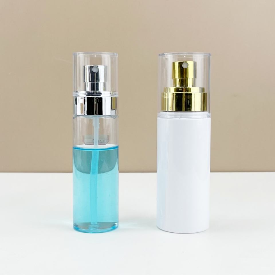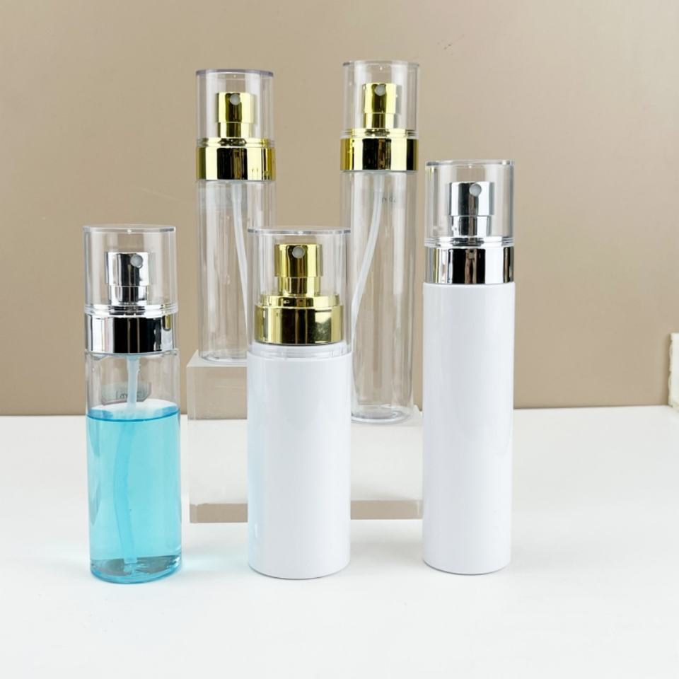 Precio Directo de Fábrica, Botella de Spray de Plástico PET Vacía de 40ml-150ml, Blanca con Tapa Dorada y Serigrafía