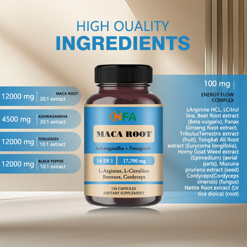 Venta directa de fábrica Cápsulas de raíz de Maca con Ashwagandha y Fenugreek Promueven el equilibrio hormonal Ayuda a la resistencia energética y Booster