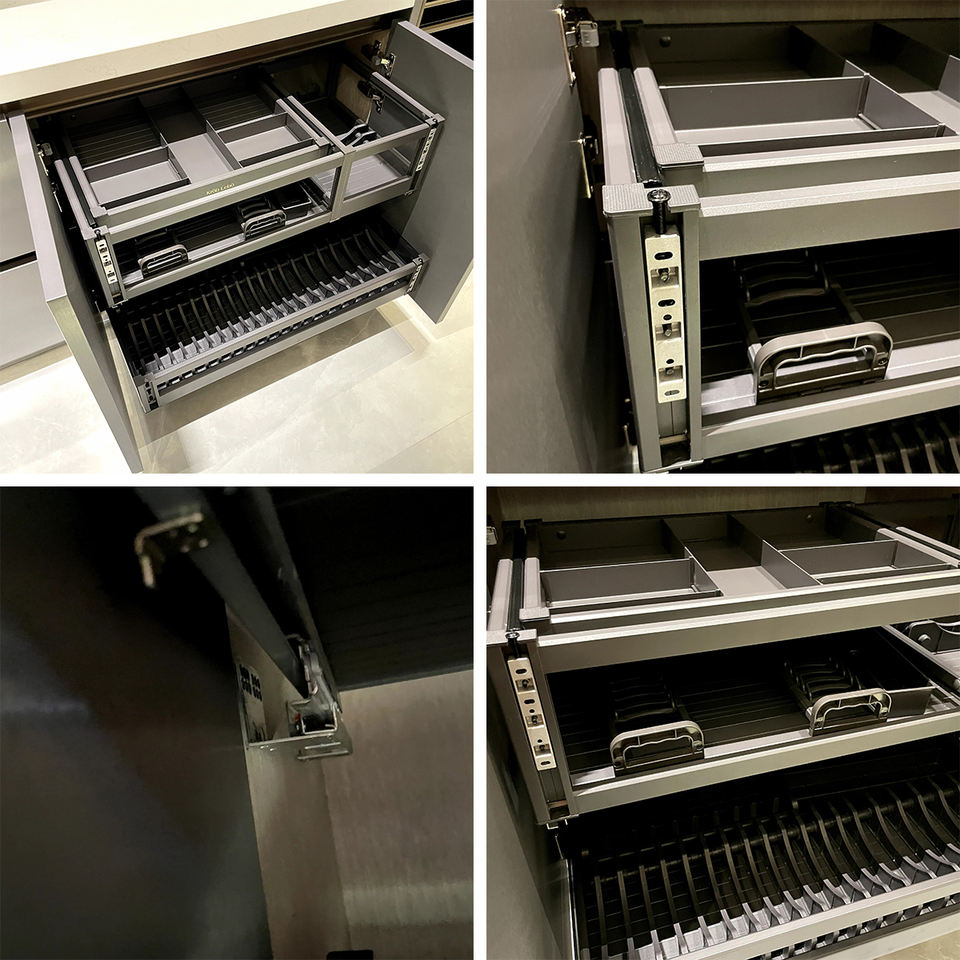 Accesorios:Protector contra salpicaduras, Cajón de cesta, Corredera de extracción, Grifo, Asa y perilla, Bisagra, Almacenamiento en alacenas esquineras, Caja de arroz, Lavabo, Puntapie, Contenedor de desperdicio