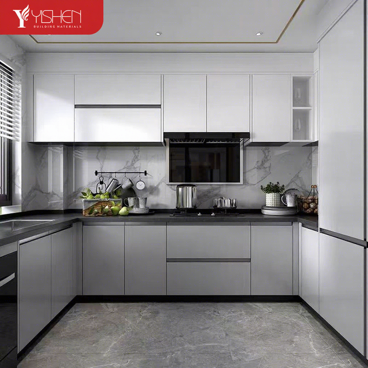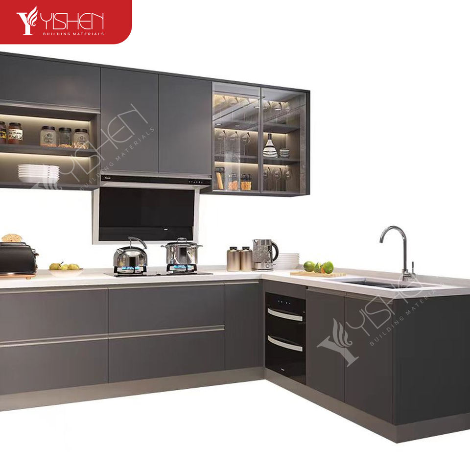 Directo de fábrica, gabinete de cocina de tablero de melamina gris personalizado, armario de cocina Modular, accesorios de grifo de isla, venta directa de muebles