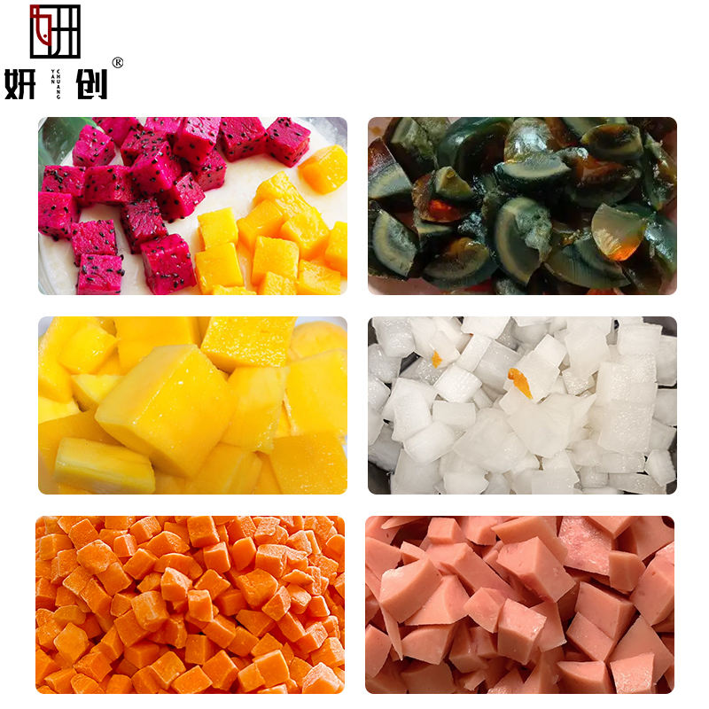 Applicable raw materials:Fruits Chicken duck cattle sheep pork all cut into cube-shaped pieces