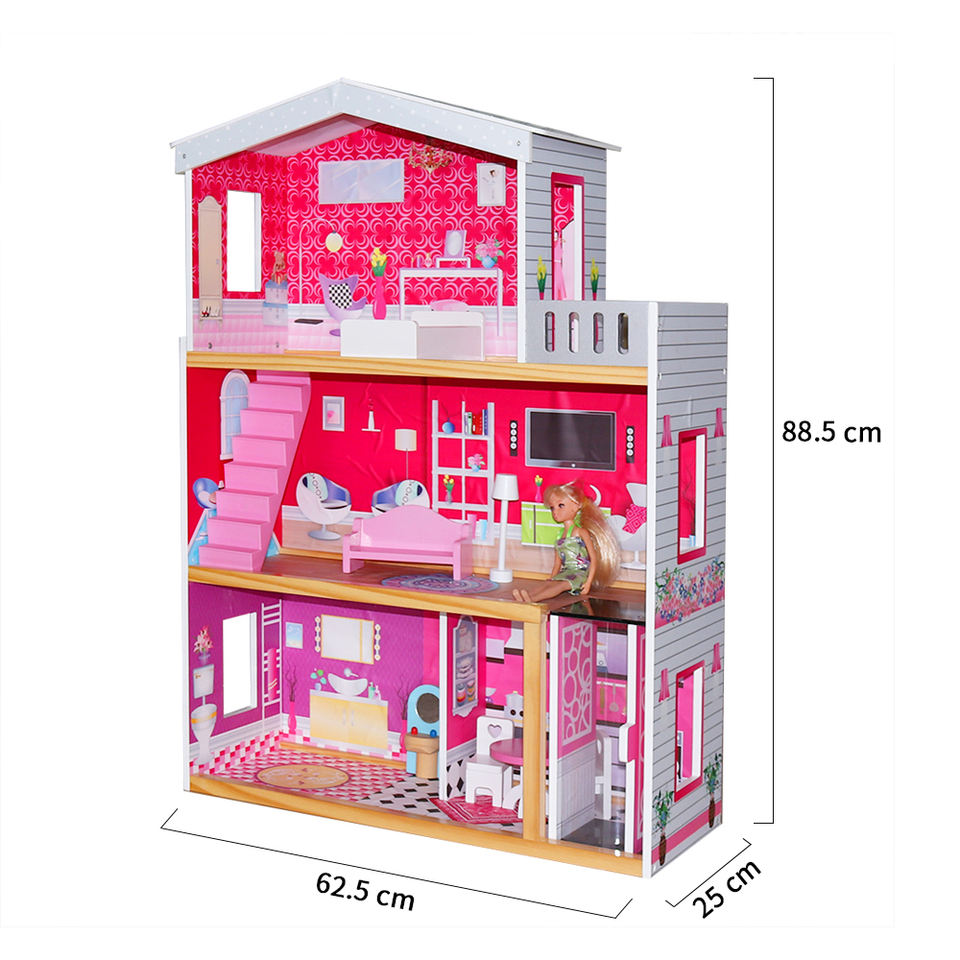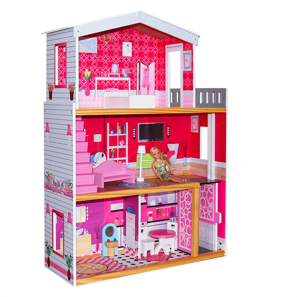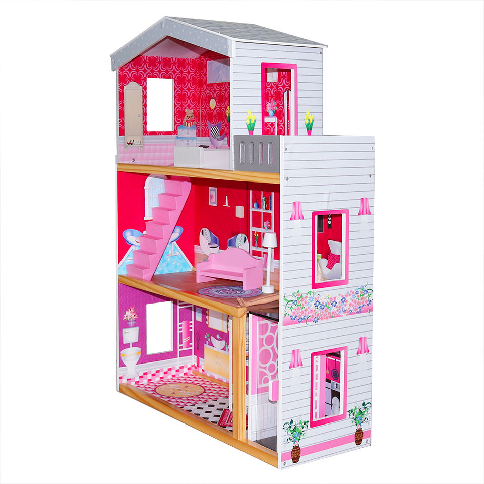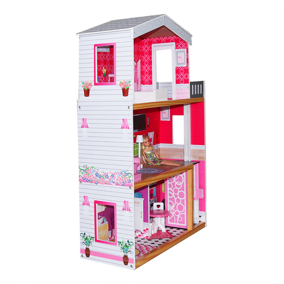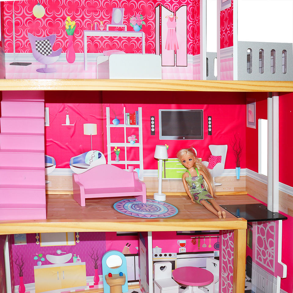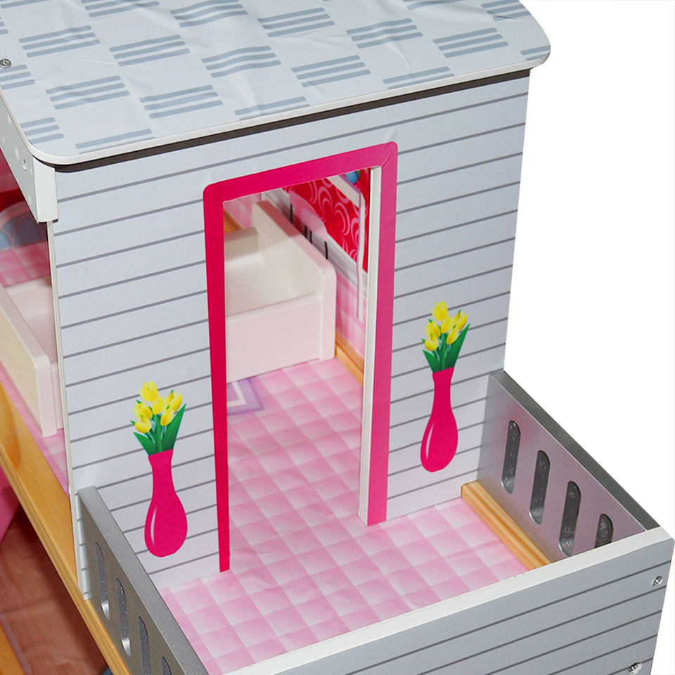 Casa de muñecas de madera de tamaño grande, juego de imitación, estilo princesa, respetuoso con el medio ambiente, color rosa, con 8 muebles pequeños, venta directa de fábrica