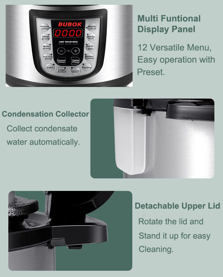 Ajustable de ajuste de presión, Preajuste del tiempo de cocción, Interior de la olla con recubrimiento antiadherente, Dispositivo de liberación de presión, Protección contra sobrecalentamiento, LED pantallaFunción