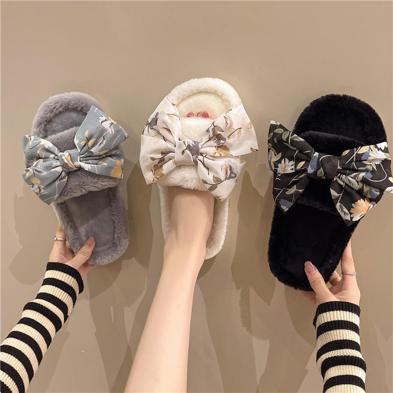 Factory Direct Sales PVC Sole Fashion Bow Slippers Flannel Warm Slippers for Autumn and Winter With Factory Latest