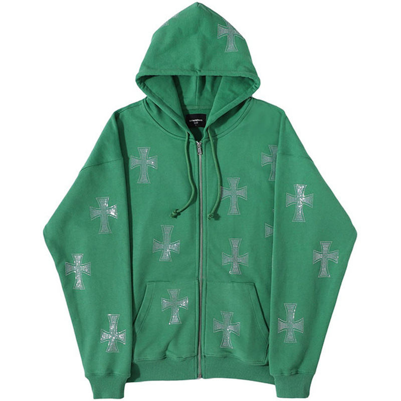 Suministro directo de fábrica Color sólido Hombres Sudaderas con capucha de diamantes de imitación Logotipo de impresión de alta calidad Sudadera con capucha con cremallera de diamantes de imitación gruesos