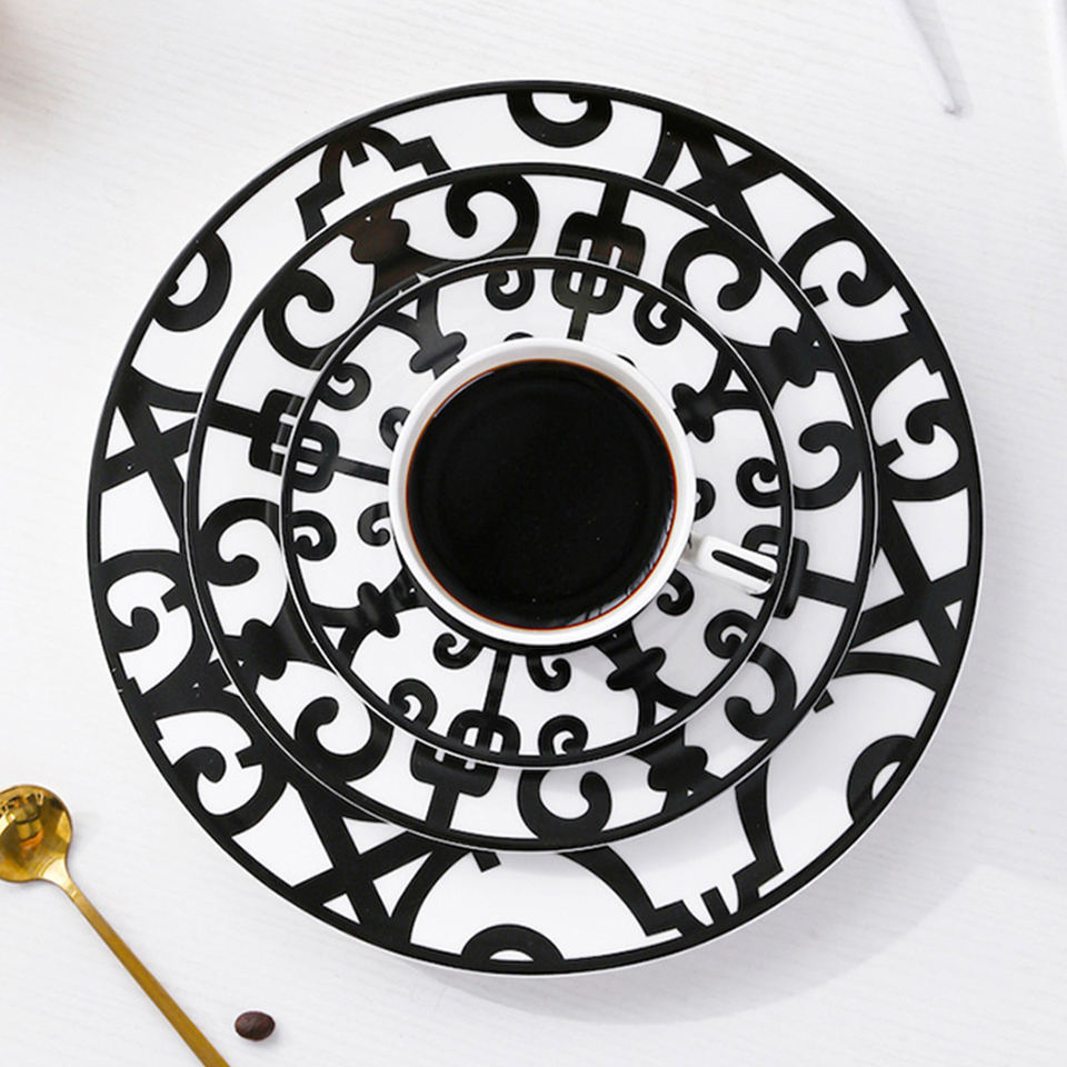 Plato redondo de cerámica de porcelana de hueso de alta calidad al por mayor directo de fábrica, juego de platos blancos y negros, postre de pastel para boda