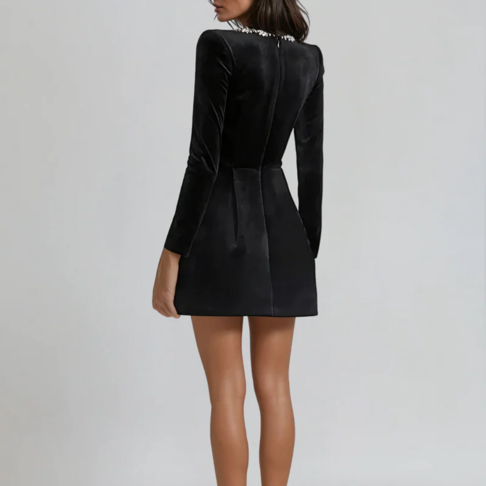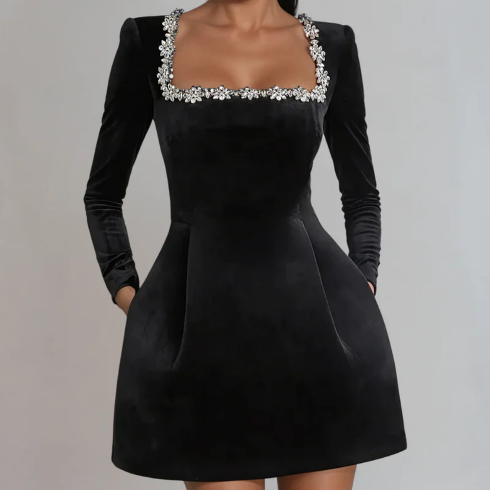 Venta al por mayor directa de fábrica: Minifalda de terciopelo con pedrería, estilo Hepburn, cuello redondo, informal. Fabricante.