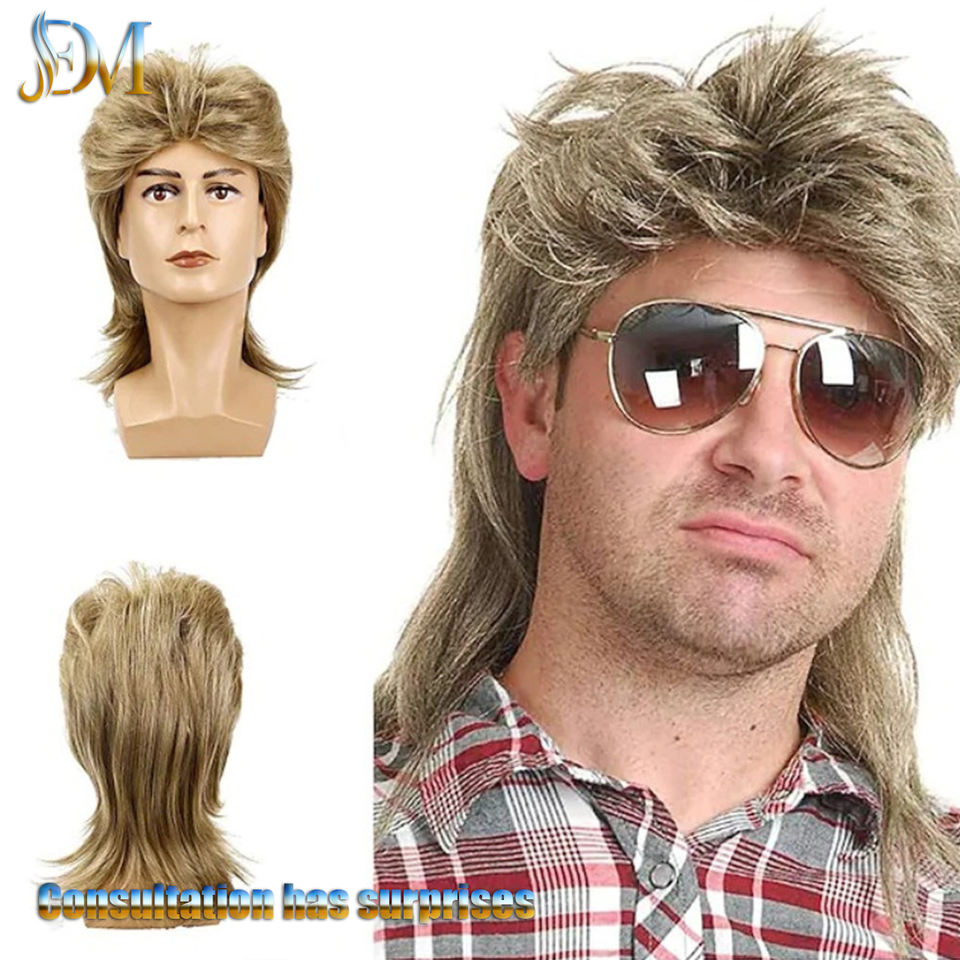 Peluca de salmonete de entrega rápida de fábrica para hombres Heavy Metal rizado corto medio hecho encaje fibra sintética Cosplay Halloween peluca cubierta