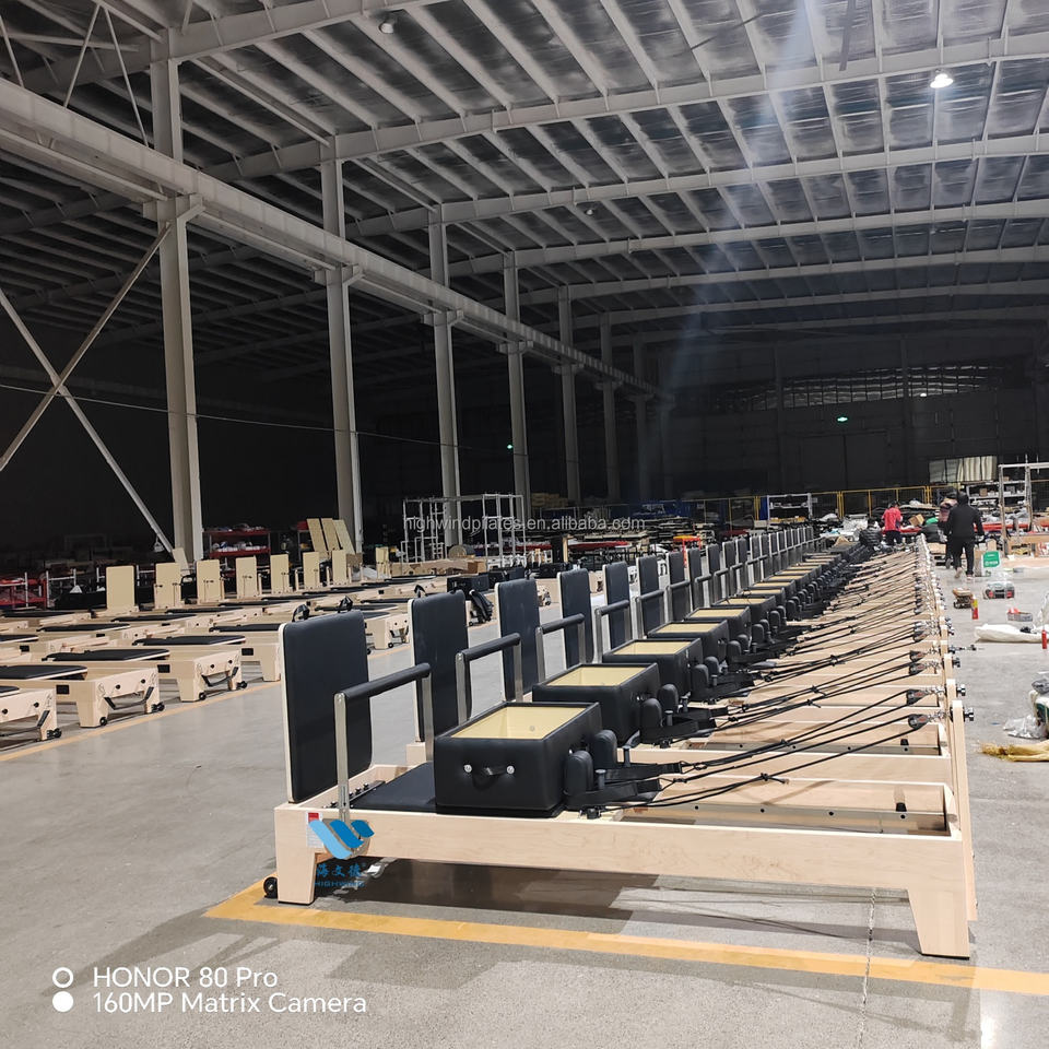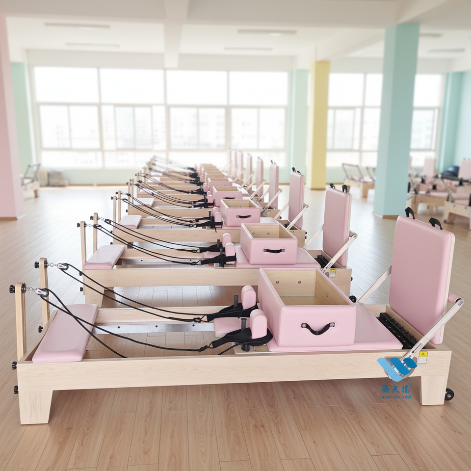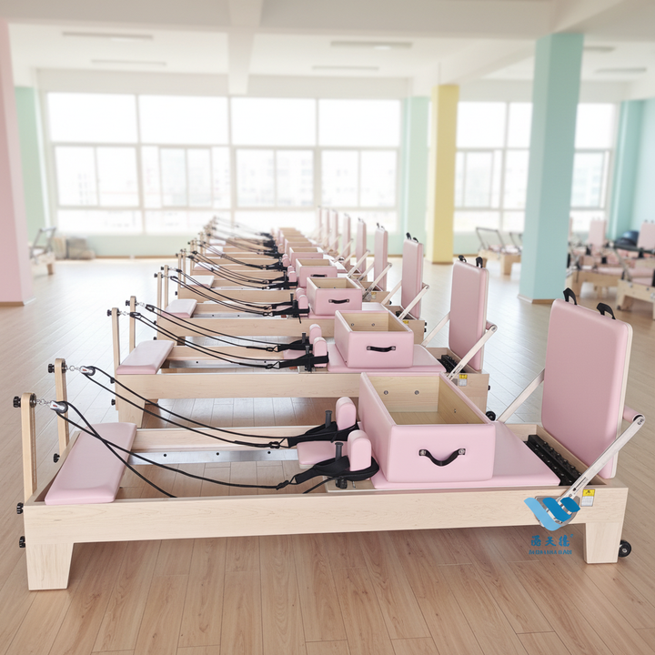 Reformer de Pilates Profesional de Alta Gama, Fabricado en Madera de Arce Blanco, para Gimnasio, Yoga y Estudio de Pilates, con Cuero Sintético Rosa