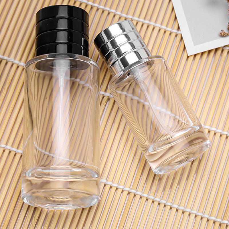 Botellas de perfume cilíndricas de hombro plano al por mayor en stock de fábrica, botellas de spray cosmético de vidrio transparente vacías para envasado.