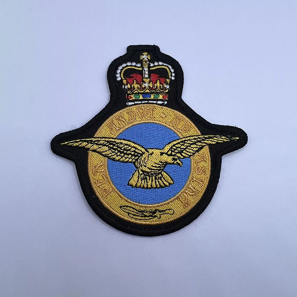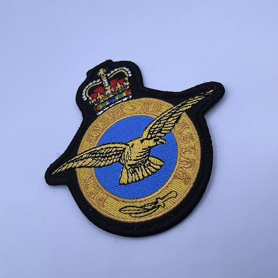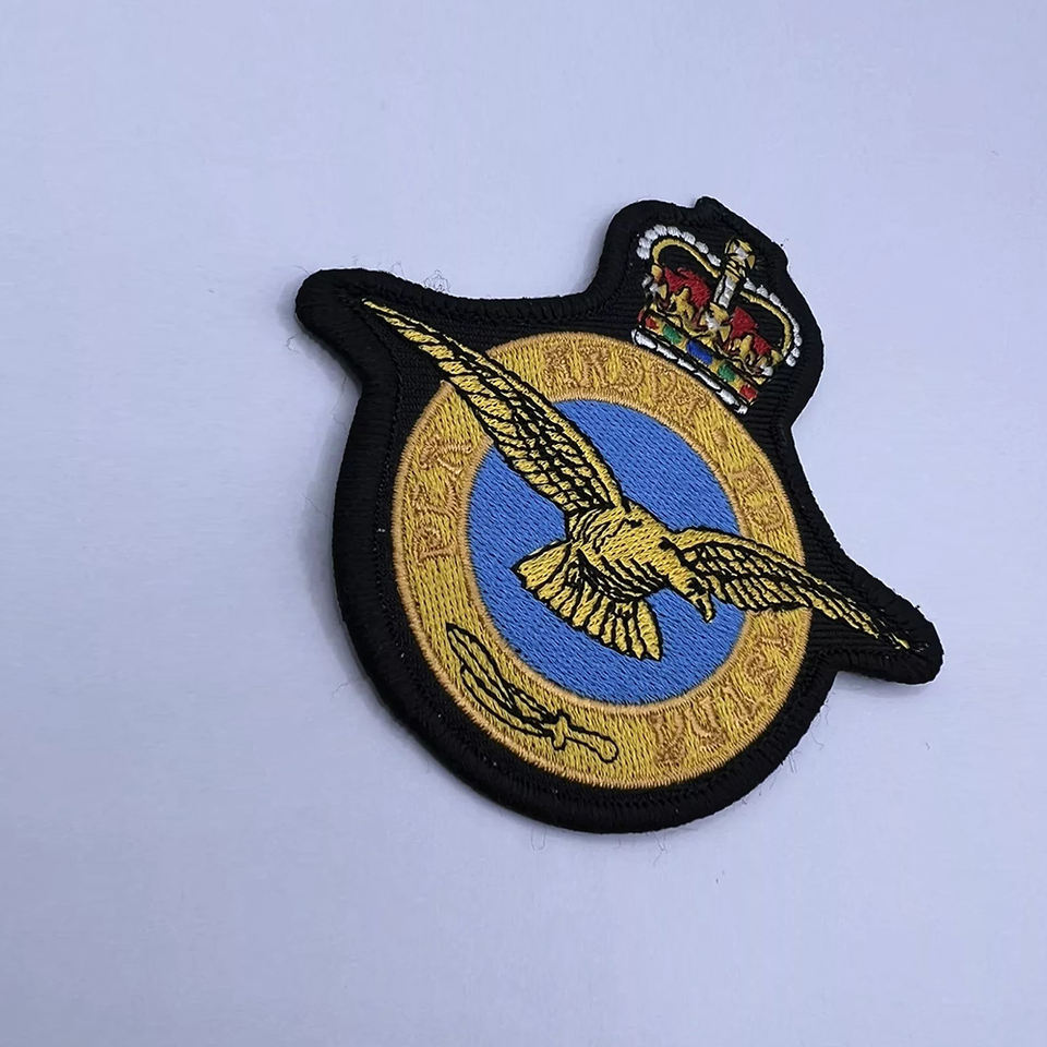 Fábrica baja Moq tela de sarga adhesivo Merrow servicio de borde forma personalizada Logo máquina bordado parches e insignias con hierro en