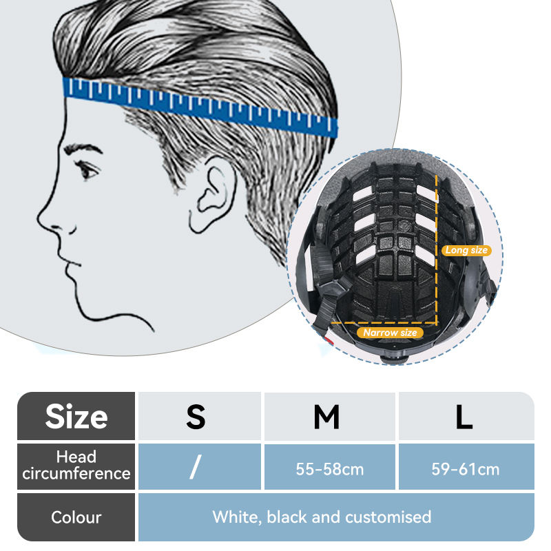 Opciones Personalizables: El casco permite logotipos personalizados, atendiendo a varios requisitos de equipo o marca, y viene en una gama de tamaños (M: 55-58cm, L: 59-61cm) para satisfacer las diversas necesidades de los usuarios.