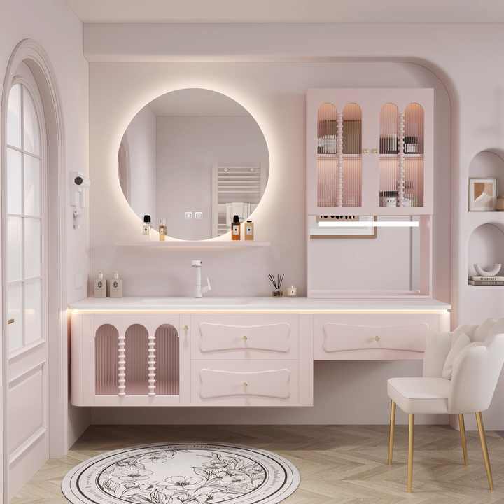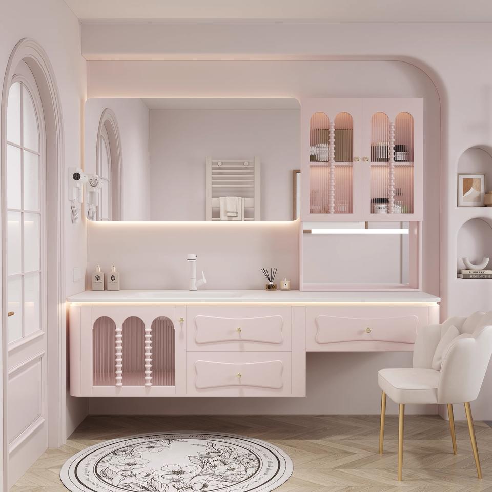 Mueble de Baño con Lavabo Doble de Diseño Italiano, Acabado Brillante en Rosa/Blanco, Espejo LED Inteligente, Nuevo de Fábrica