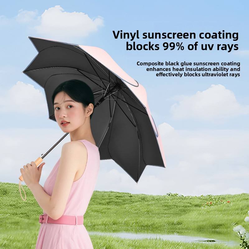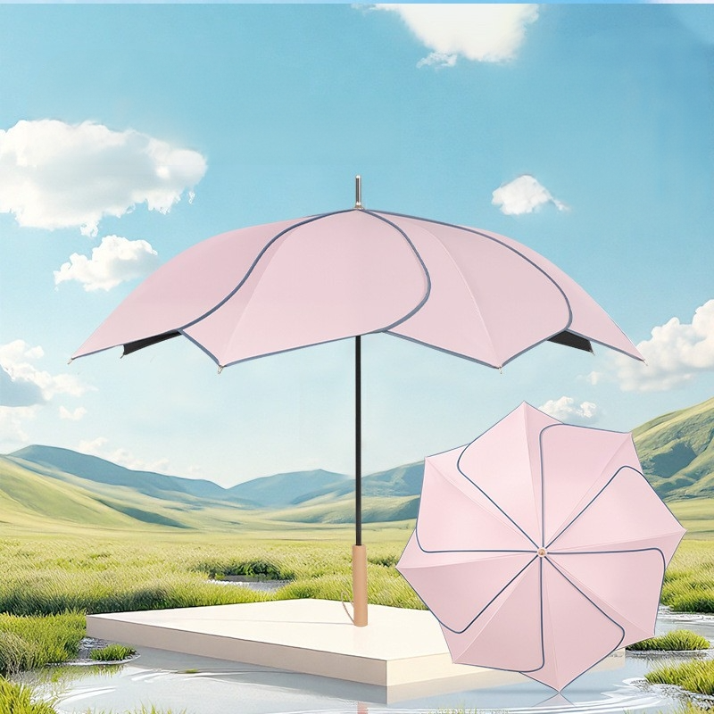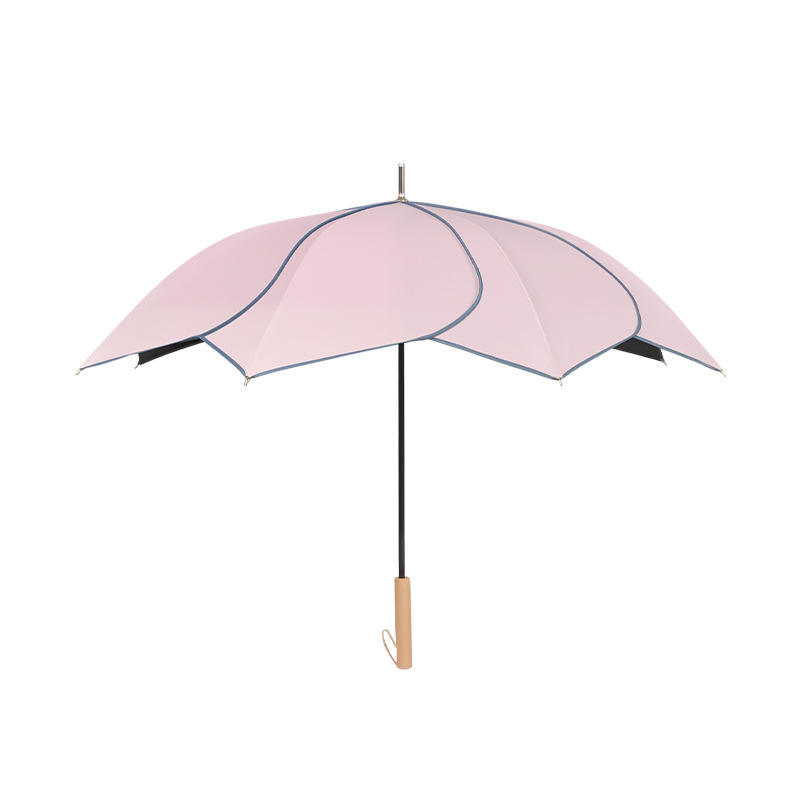 Paraguas de Fábrica OEM con Logotipo Personalizado, Forma de Pétalo, Mango de Madera, 8 Varillas Rectas, Recubrimiento Negro UPF50, para Regalo de Boda, para Mujer, Protección Solar y Lluvia