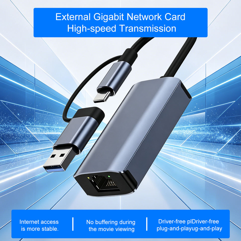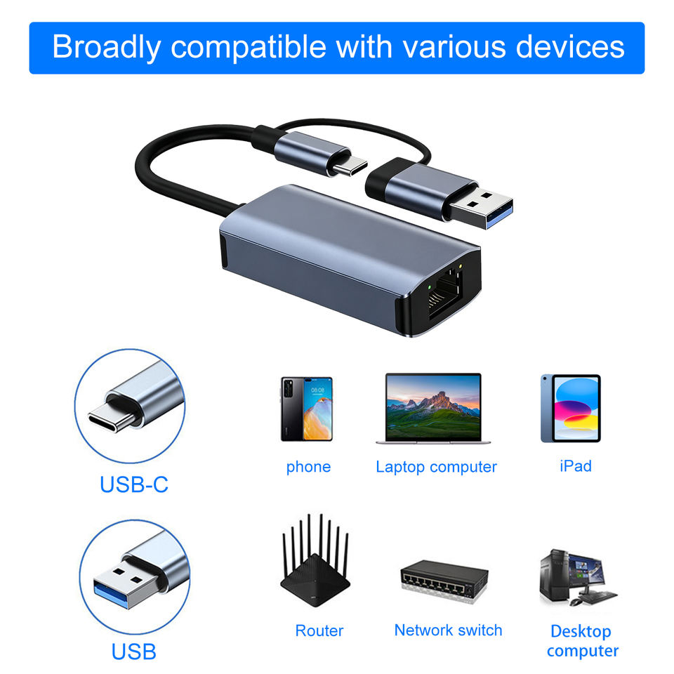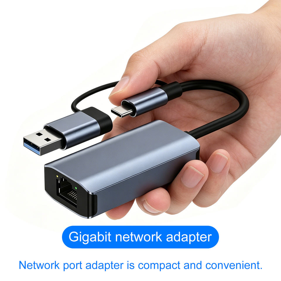 Base de Conexión Multipuerto OEM de Fábrica 2 en 1 USB3.0 Tipo C a Tarjeta de Red RJ45 de 1000Mbps para PC, Conversor Divisor de Doble Cabezal para Expansión