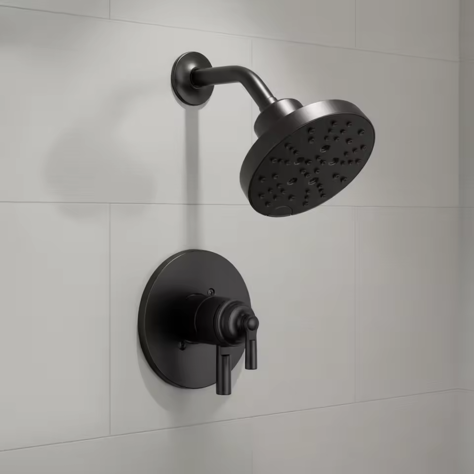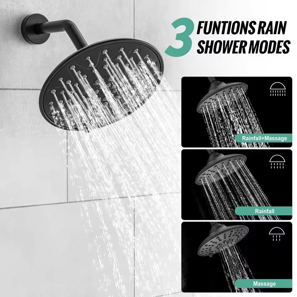 Juego de grifería de ducha OEM de fábrica con válvula de presión equilibrada mate, cabezal de ducha con manija negra y mezclador de ducha oculto de latón acabado.