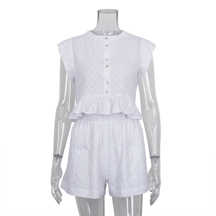 Conjunto de Dos Piezas para Mujer, Camiseta de Manga Corta con Volantes Jacquard de Oficina, Color Blanco, Conjunto Casual de Dos Piezas con Pantalones Cortos