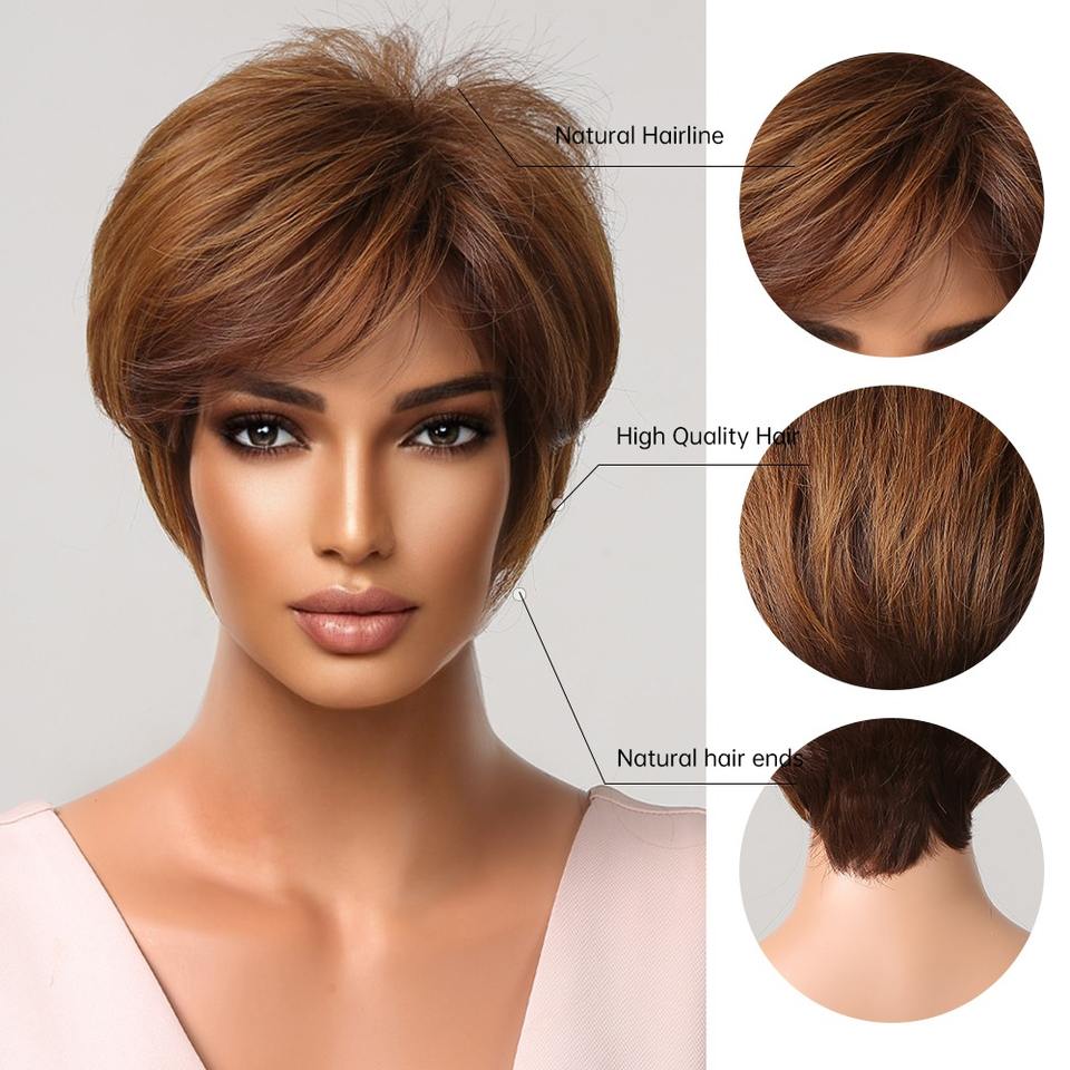 Pelucas Cortas de Estilo Pixie para Mujer, Color Afro Dorado Chocolate, Cabello Sintético con Flequillo, Resistente al Calor, Venta Directa de Fábrica