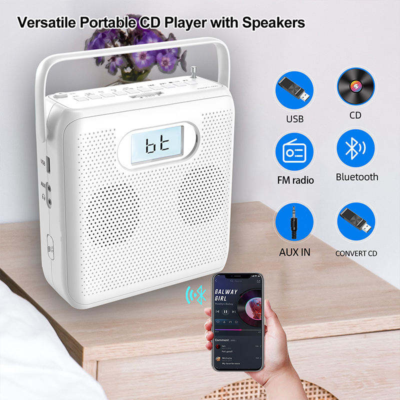 Reproductor de CD Portátil con Bluetooth, Radio FM, Reproductor de MP3 USB, Entrada AUX, Convertidor de CD a USB, Altavoz Estéreo, para el Hogar, Aire Libre y Estudio