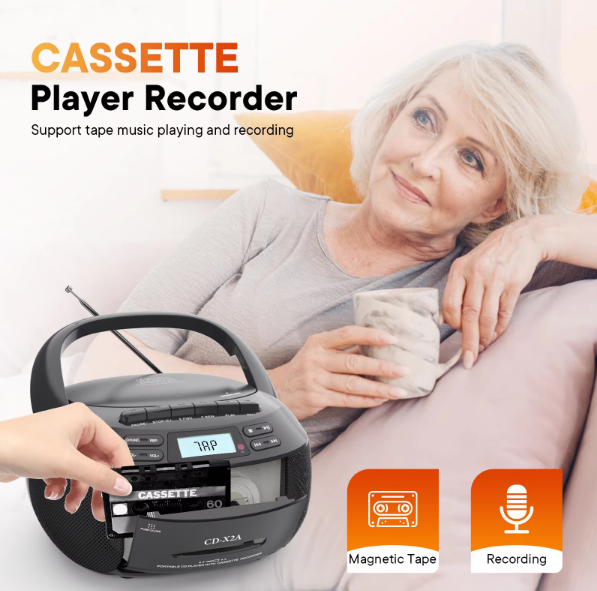 Reproductor de CD y Casetes Portátil X2C, Radio FM, Grabadora de Casetes, USB, SD, MP3, BT, Sistema de Audio para el Hogar, Oficina y Viajes