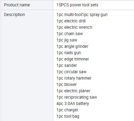 Nombre del producto:Juego de herramientas eléctricas multifunción de 15 piezas
