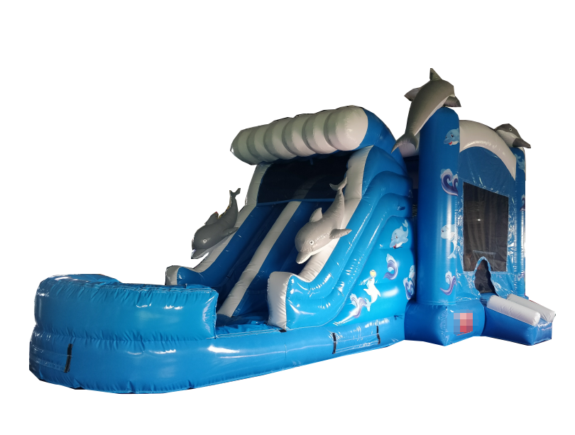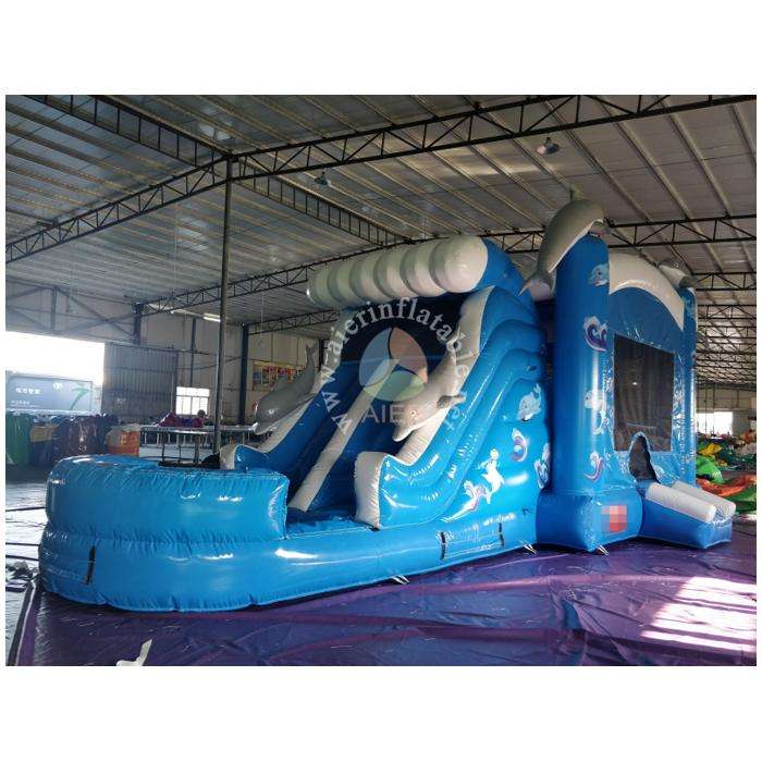 Castillo Inflable Comercial de Doble Carril con Tobogán y Piscina, Diseño Delfín Azul, Precio de Fábrica, para Fiestas y Eventos Infantiles de Verano