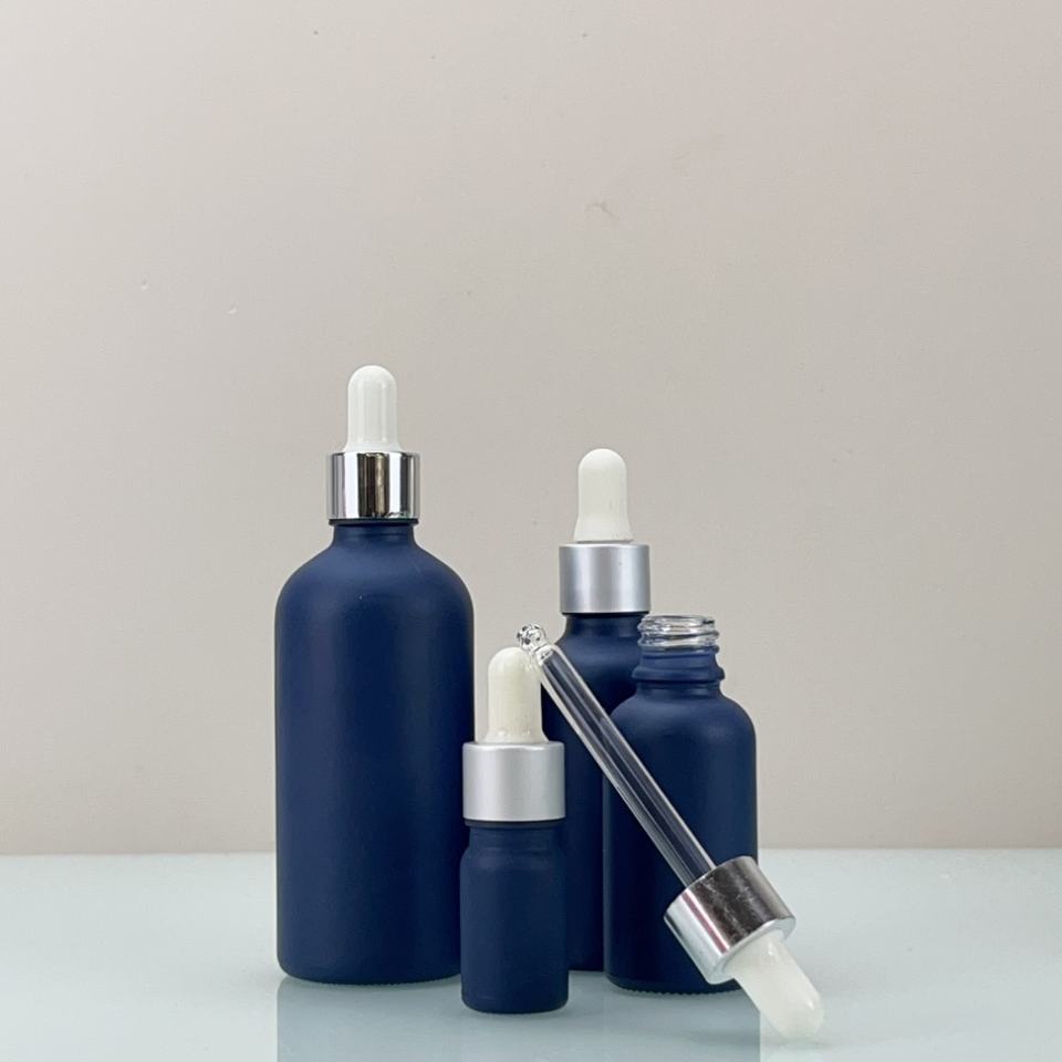 Botella de Vidrio Esmerilado Azul Redonda de 15ml, 30ml, 50ml con Gotero para Aceites Esenciales y Tapa Dorada, Precio de Fábrica, para Suero Cosmético