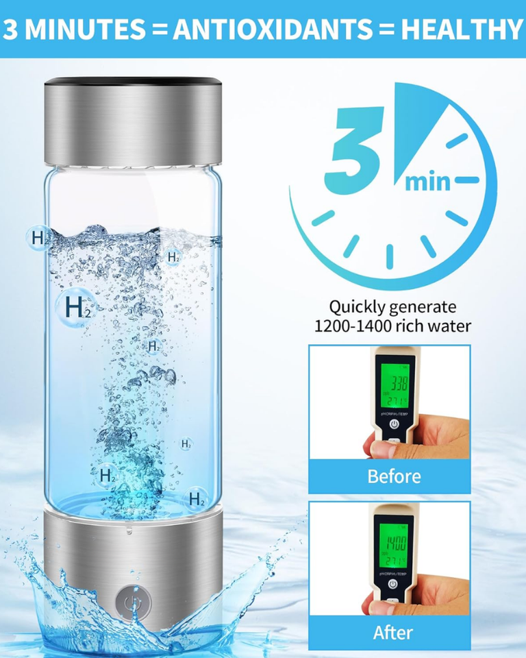 Precio de Fábrica PUREFLOW Botella de Agua Fría de Hidrógeno Recargable por USB de Vidrio de 460 ml, 2000 ppb, Alto PPM, para Uso en Exteriores, Automóviles y Hogares