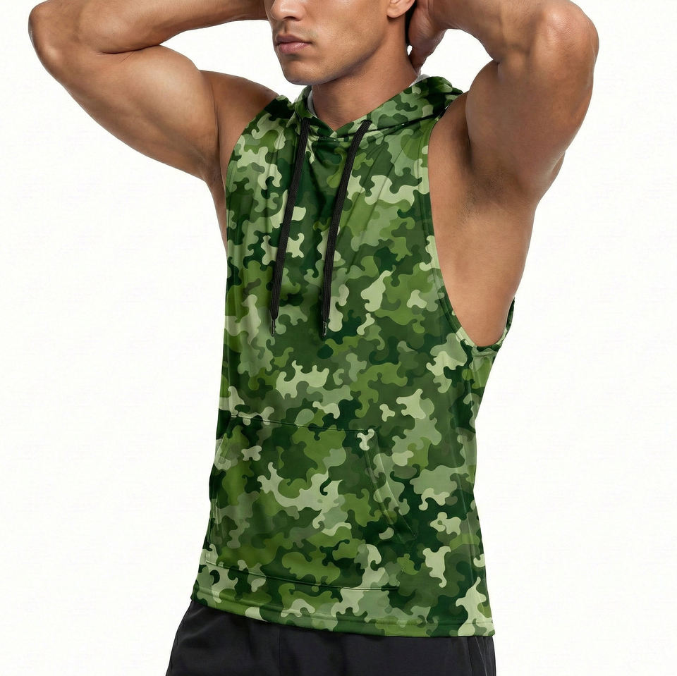 Camiseta sin mangas con estampado personalizado para hombre, estilo camuflaje desgastado, con cordón y bolsillo frontal, ideal para gimnasio y culturismo, precio de fábrica.