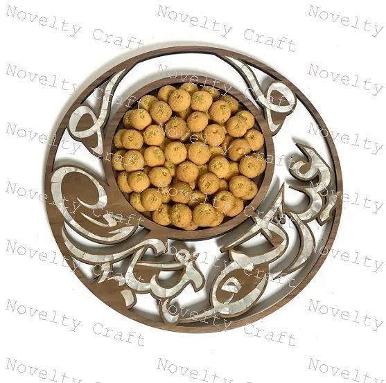 Venta de fábrica Ramadán Eid regalo redondo Acacia madera Chocolate bandeja para servir madre de perla incrustaciones postre bandeja para servir