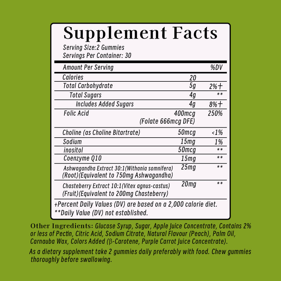 Ácido fólico, Sodio, Extracto de Ashwagandha, Extracto de Chasteberry, Coenzima Q10, Inositol, ColinaIngrediente principal