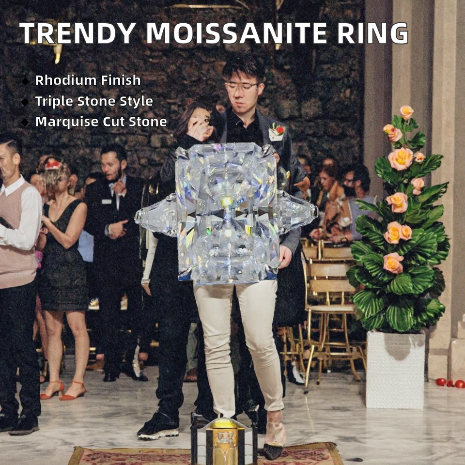 Anillo de tres piedras de moissanita con corte esmeralda de plata de ley S925 chapado en platino Tishya, engaste clásico de tres puntas, 5 g.