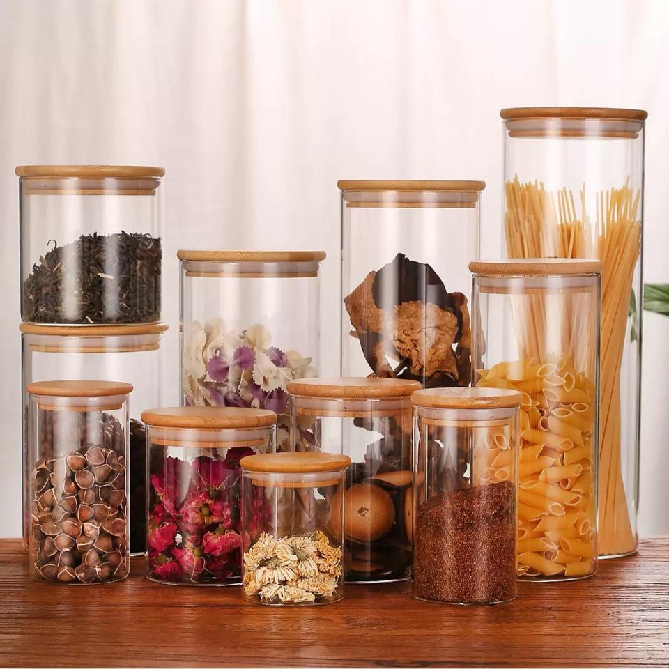 Tarro de cristal para almacenamiento de cocina con tapa de madera de bambú