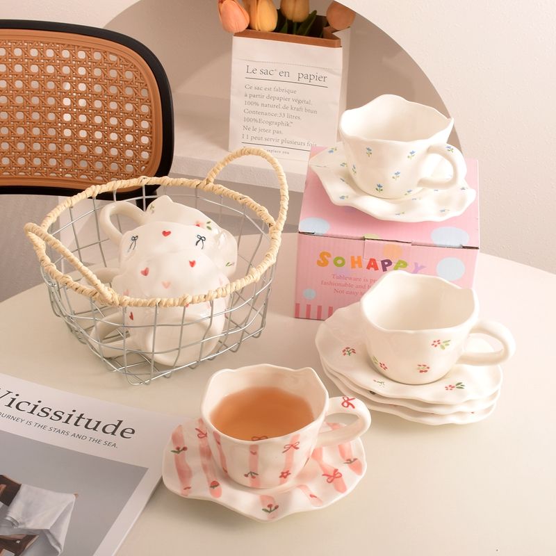 Venta al por mayor de fábrica, personalización, juego de taza y platillo de cerámica irregular hecha a mano de 200 ml, taza de porcelana para regalo, para café con leche o té