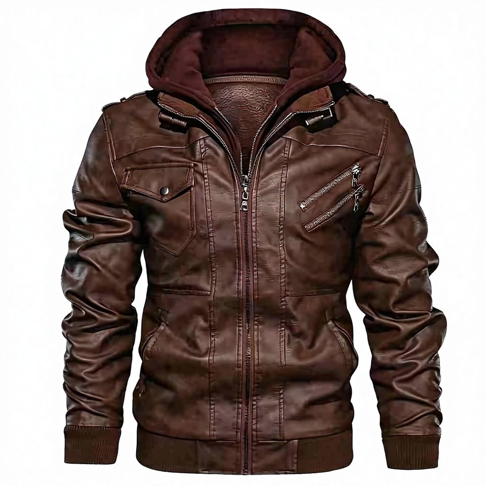 Chaqueta de cuero PU para hombre, estilo motociclista, talla grande, con capucha, transpirable, con cremallera, para otoño, en marrón y negro, venta al por mayor de fábrica.