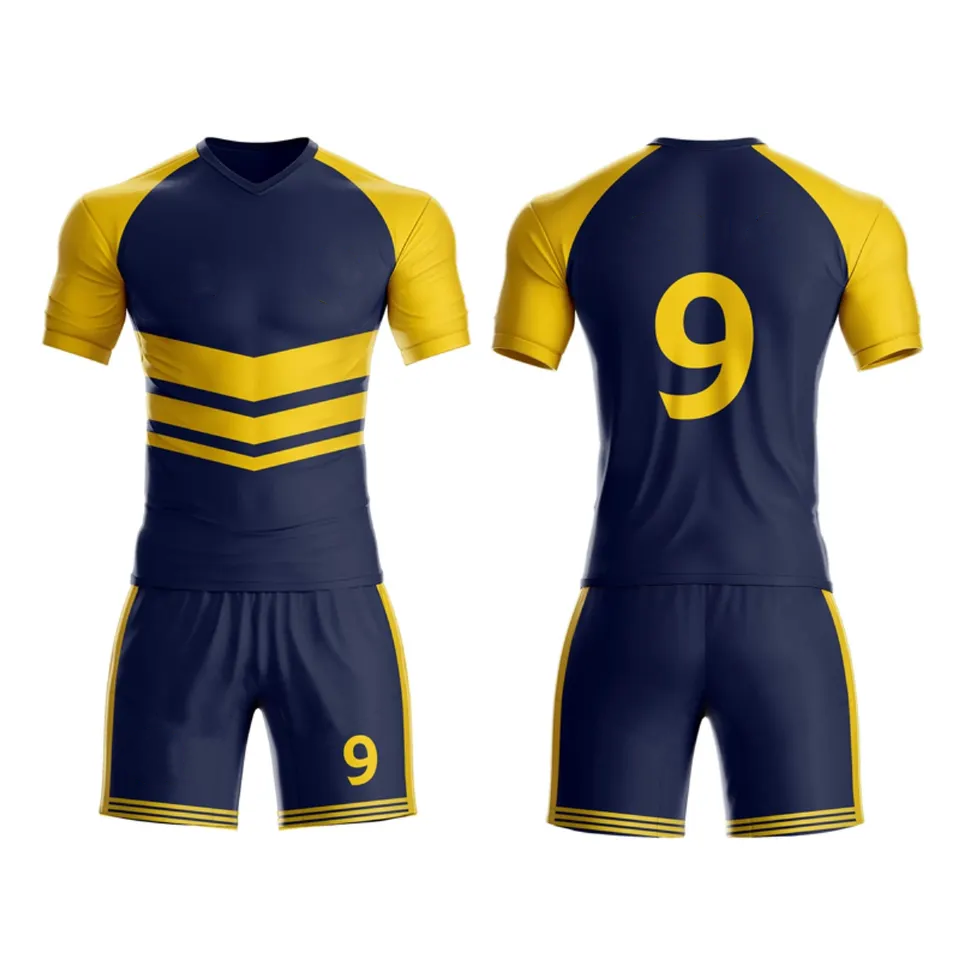 Venta al por mayor de fábrica, conjunto de camisetas de fútbol de alta calidad, impresión por sublimación, logotipo personalizado, camisetas de fútbol transpirables de secado rápido para hombres